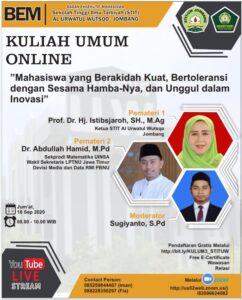 WEBINAR yang diselenggarakan BEM STIT al Urwatul wutsqo Jombang, dengan tema Mahasiswa yang Berakidah Kuat, Bertoleransi dengan Sesama Hamba-Nya, dan Unggul dalam Inovasi